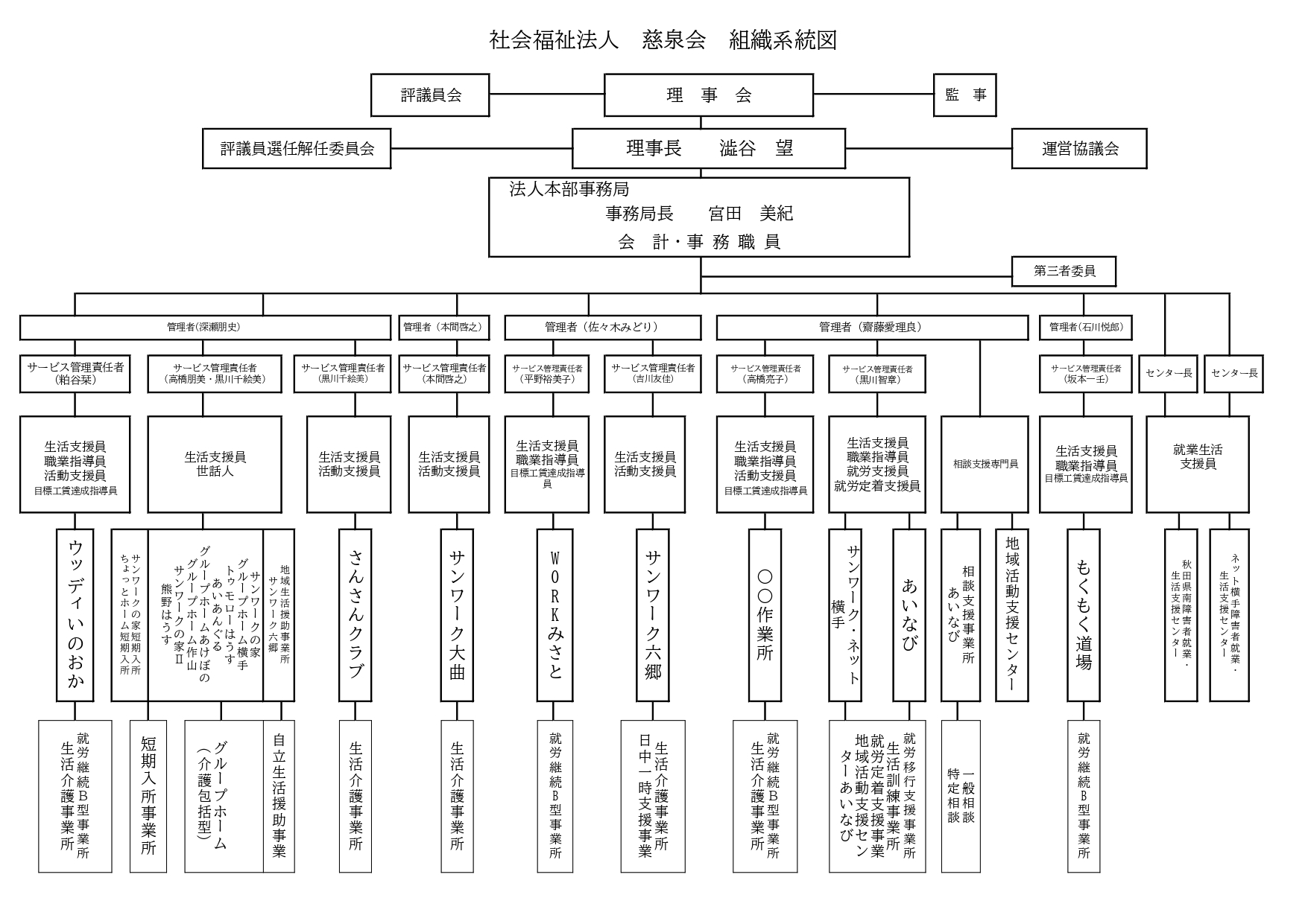 社会福祉法人慈泉会は、多様な福祉サービスがその利用者の意向を尊重して総合的に提供されるよう創意工夫することにより、利用者が個人の尊厳を保持しつつ、自立した生活を地域社会において営むことができるよう支援することを目的として次の社会福祉事業を行う。
